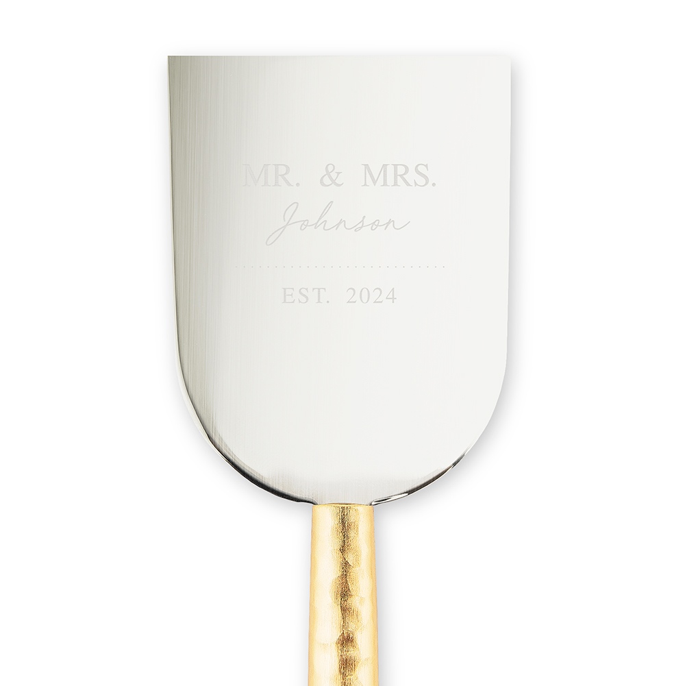 Custom Engraved 3-Piece Gold Handled Cheese Knife Set – Mr. & Mrs., Custom Engraved 3-Piece Gold Handled Cheese Knife Set – Signature Script, Custom Engraved 3-Piece Gold Handled Cheese Knife Set – Modern Serif Initial