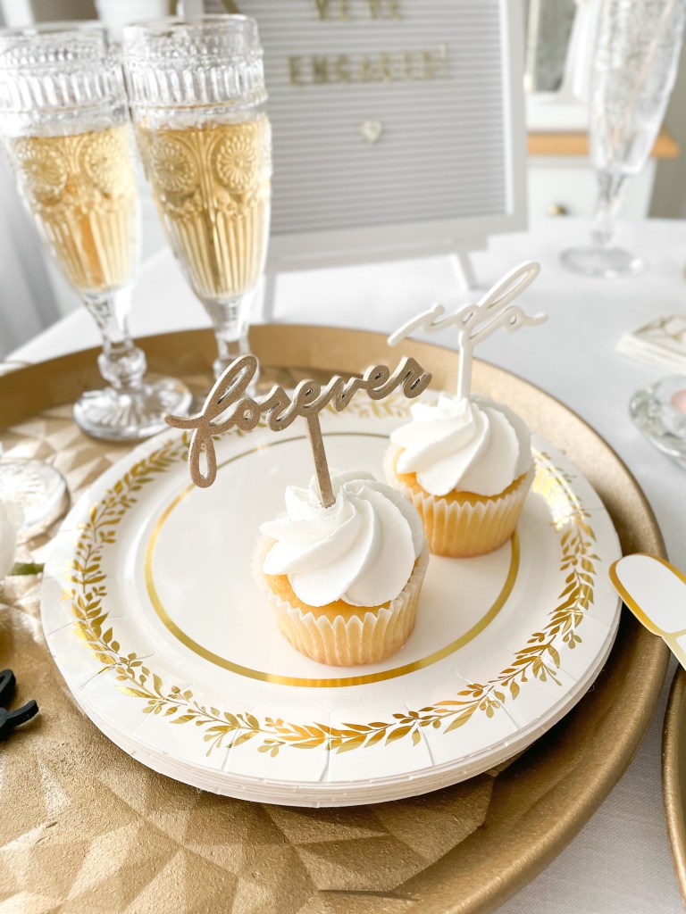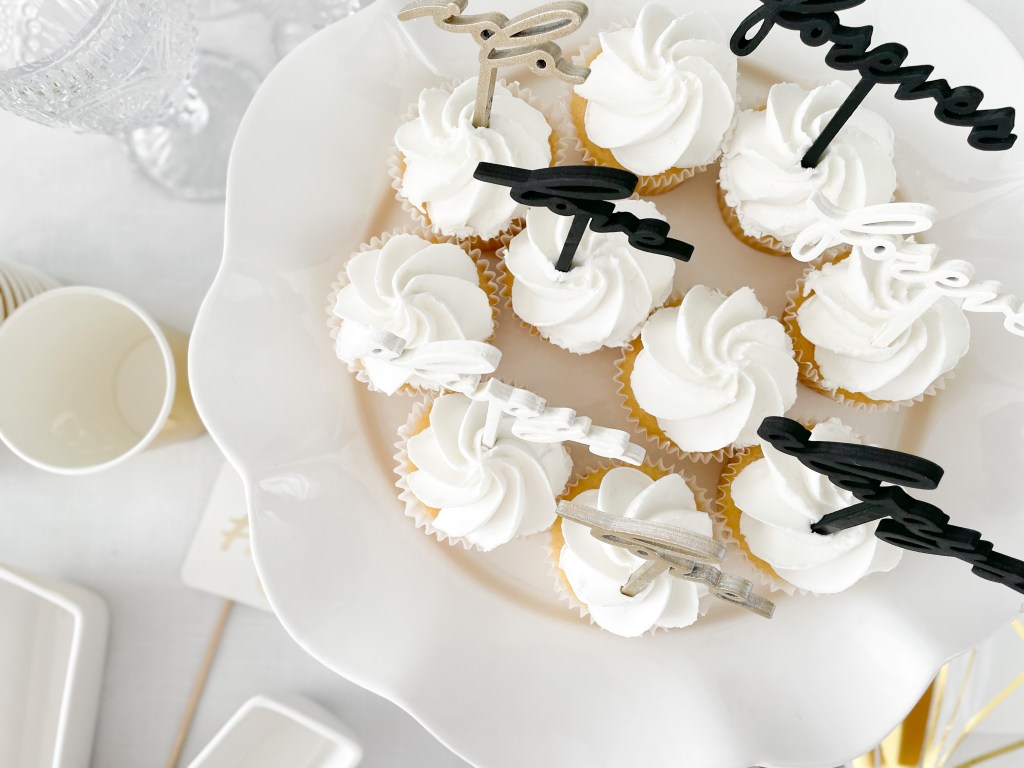You know what they say: Two desserts are better than one! Okay, maybe that isn’t a real saying, but it should be. Dress up your cupcakes with these engagement themed wooden picks; you can leave them as is in natural wood, or paint them to match your theme with food safe paints. We painted ours in shades of black, creamy white, and gold.