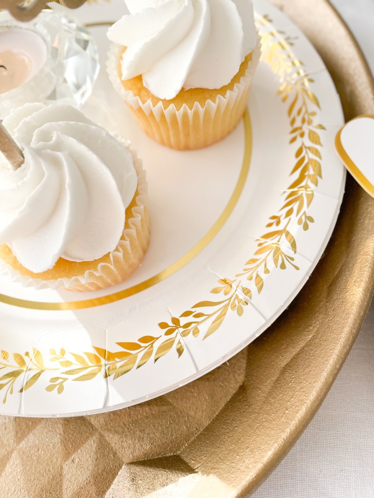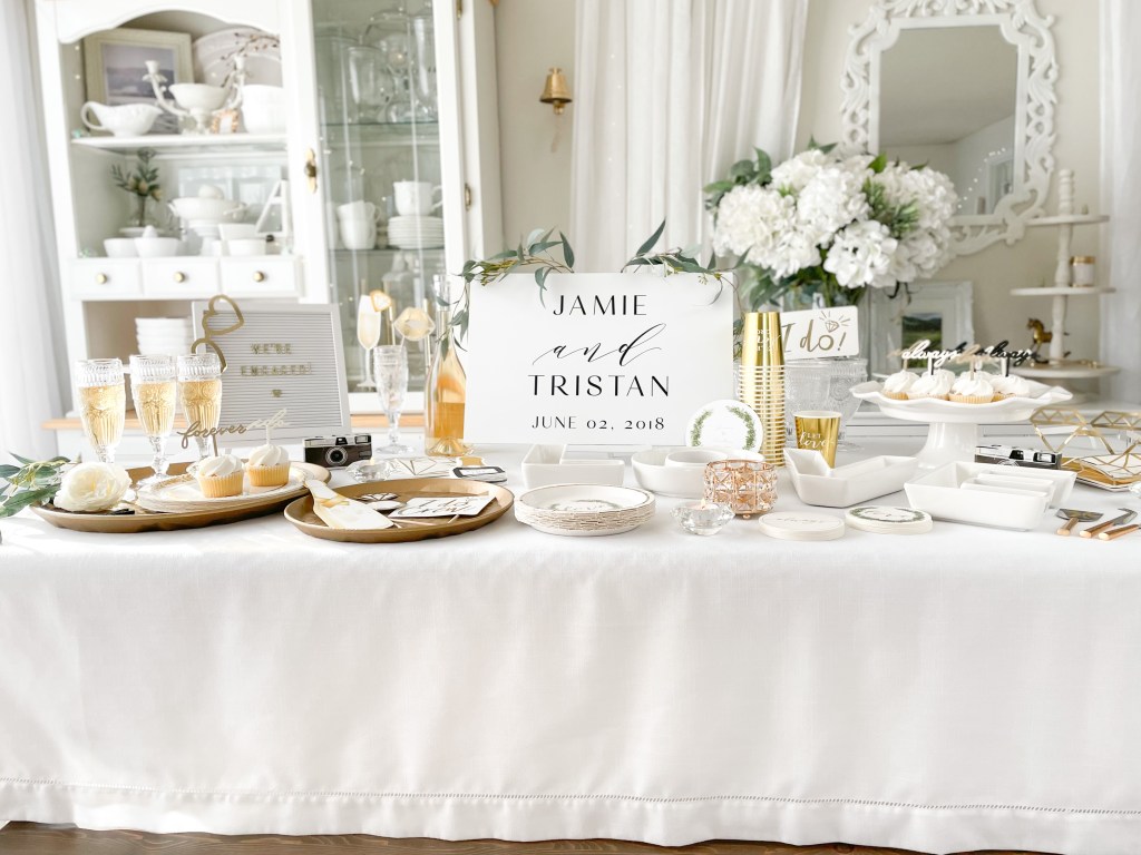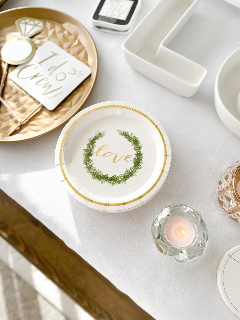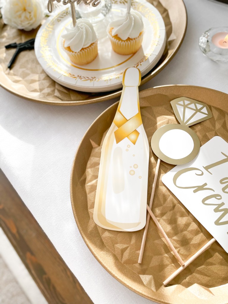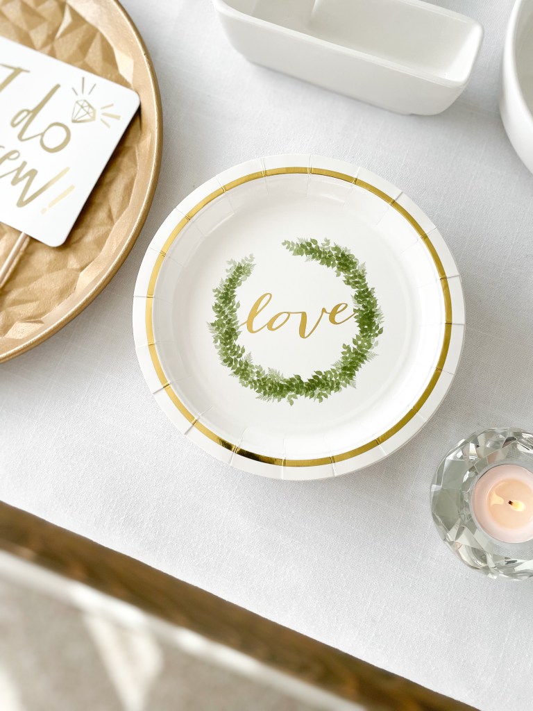 Congratulations! It’s time to pop the bubbly! After putting a ring on it, many couples like to celebrate their new relationship status’ by throwing an engagement party. With my partner company Weddingstar, we are going to show you how to style a classic green and gold ‘we said yes!’ soirée, using almost exclusively Weddingstar products. That’s right, nearly every single thing pictured here is from Weddingstar! From the paper plates, napkins and coasters, to the personalized signs, photobooth props and serving trays, Weddingstar has everything you need to kick off engaged life on the right foot.