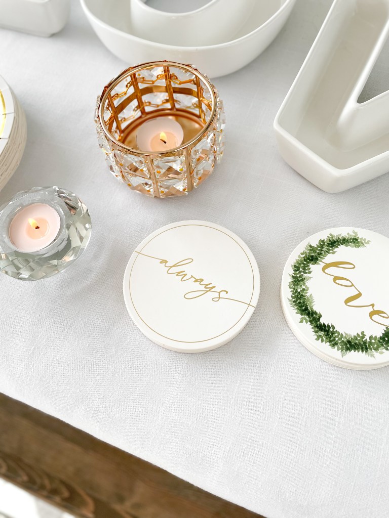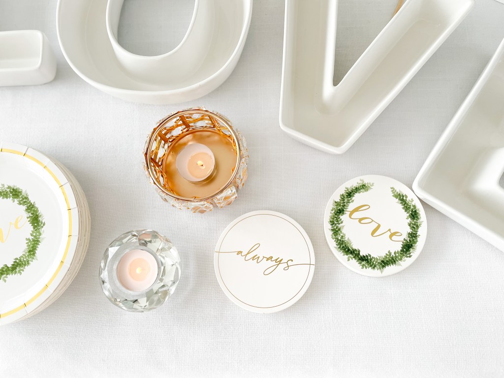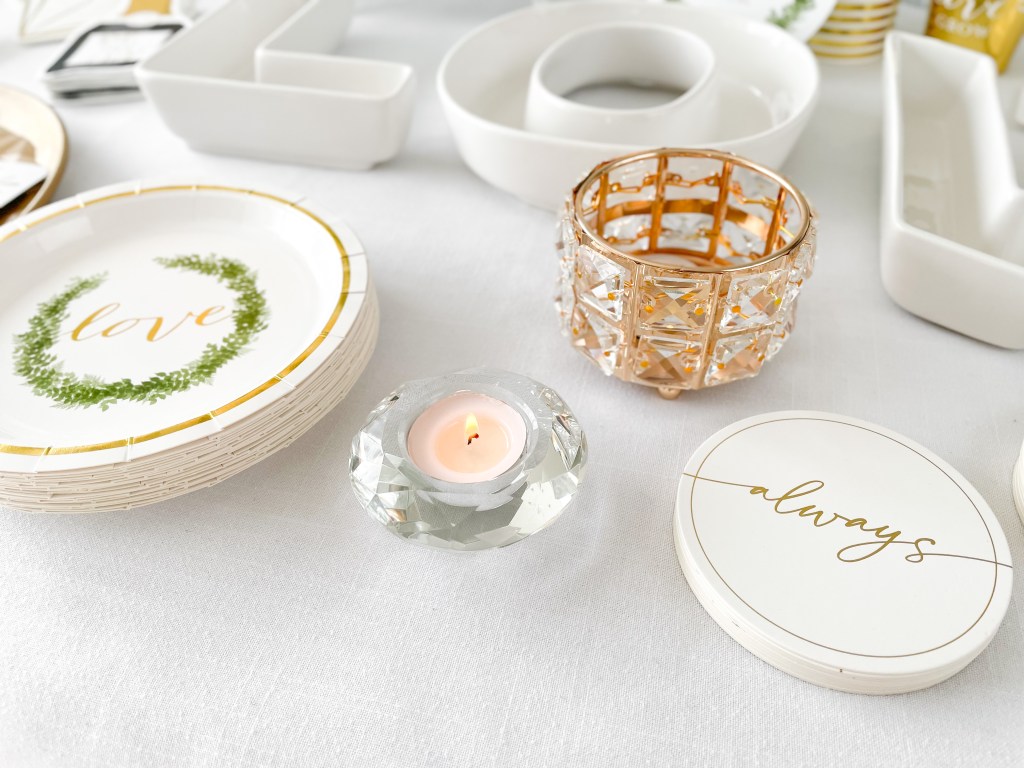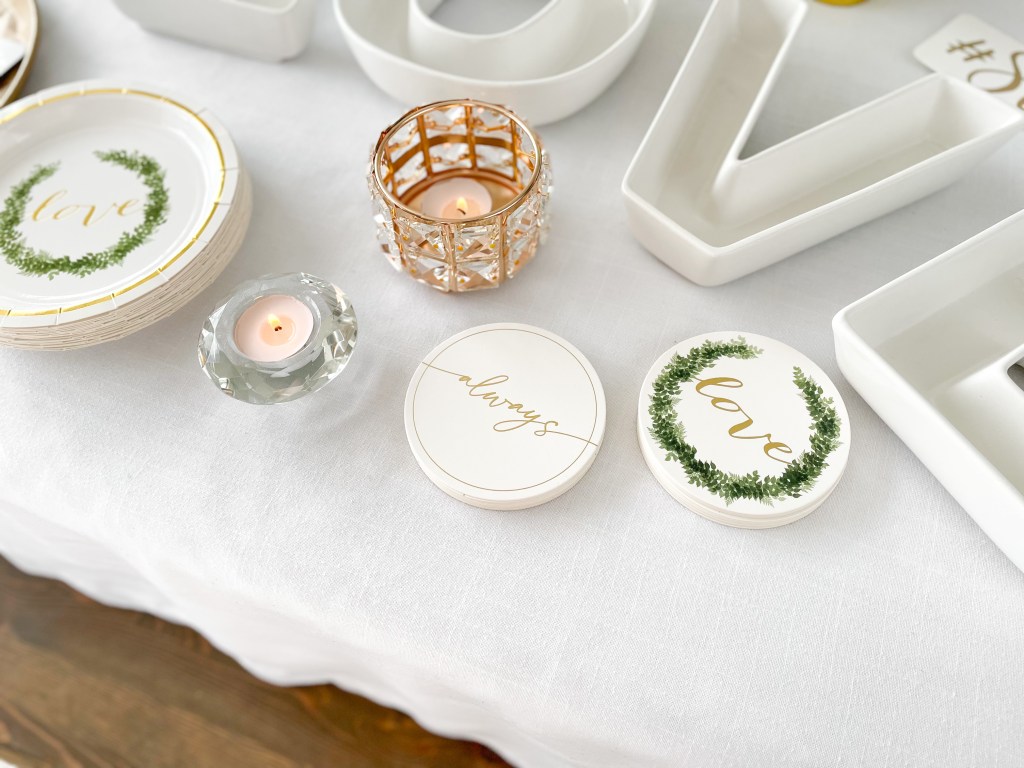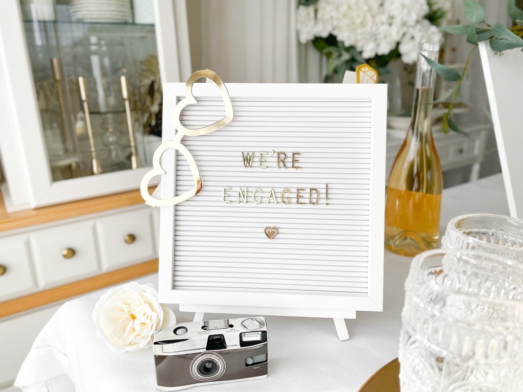 Don’t skip the finer details! The LOVE dish set is perfect for setting out snacks such as party mix, personalized m&m’s or jelly beans, or even drink garnishes such as lemons, limes, drink umbrellas and stir sticks. The white and gold letter board is Weddingstar’s contribution to the popular letter board home decor trend – spell out our standard ‘We’re Engaged!’ quote complete with a dainty heart, or personalize it to yourselves with a personal quote including your names.
