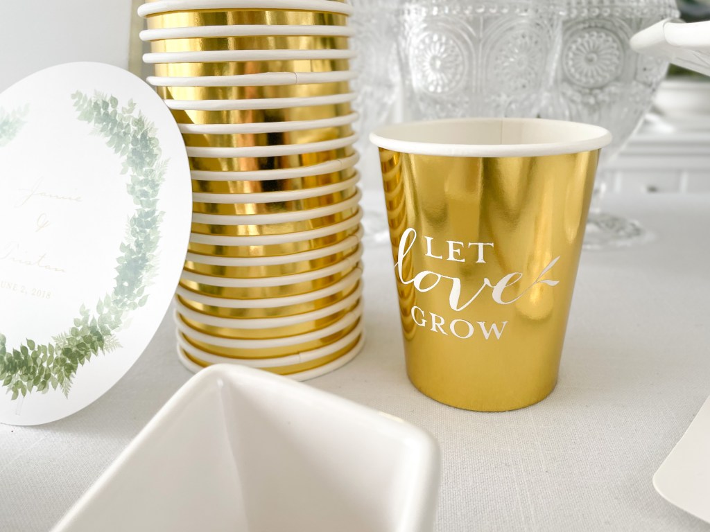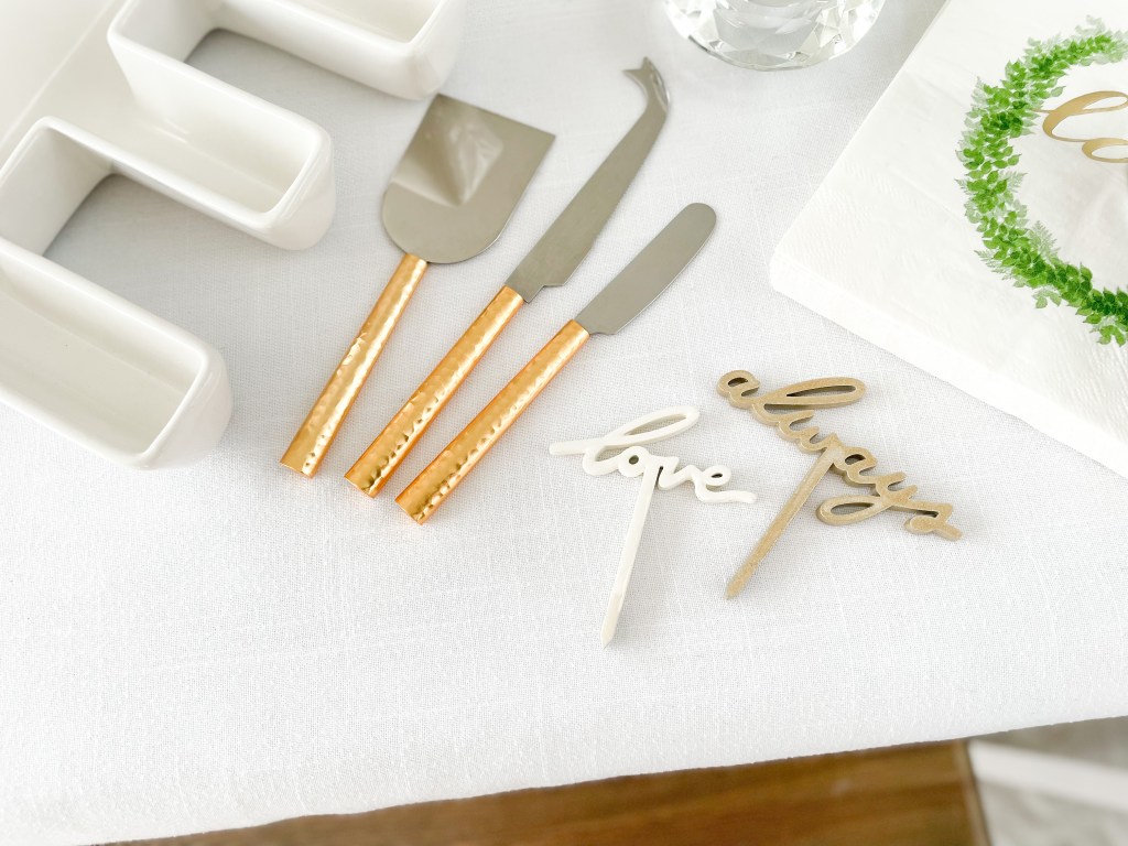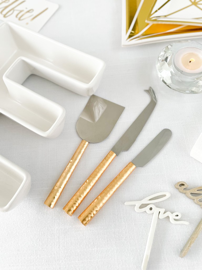 If you choose to serve finger foods like charcuterie or spreads, be sure to include Weddingstar’s gold handled cheese knife set, the loveliest accompaniment to the green and gold theme of this party.