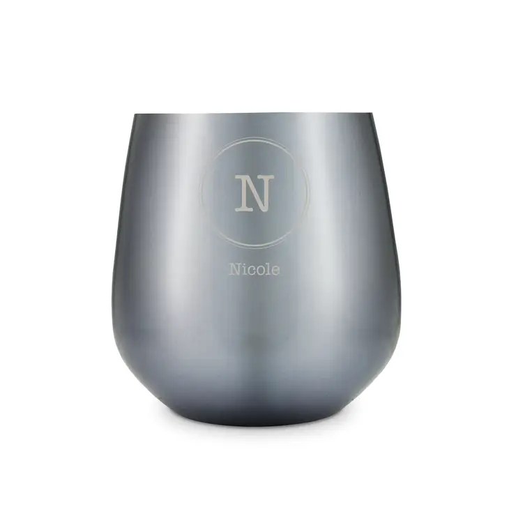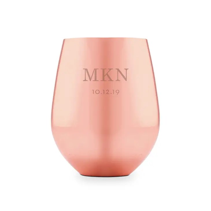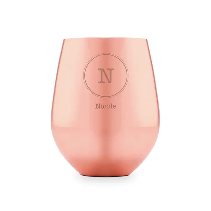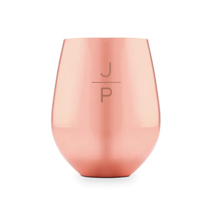 Copper Stemless Wine Glass – Classic Initials Etching, Copper Stemless Wine Glass – Stacked Monogram Etching