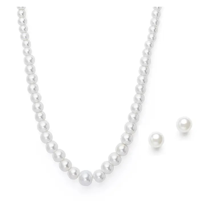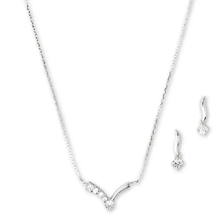 Silver Necklace And Earring Set – Crystal Chevron Pendant, Classic Pearl String Necklace And Earring Set