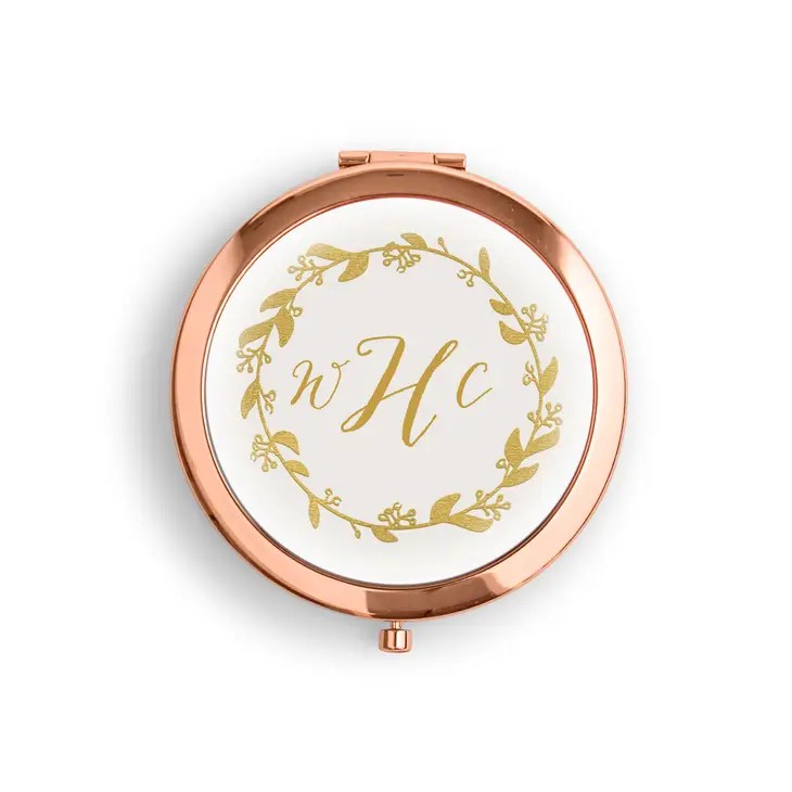Personalized Engraved Bridal Party Compact Mirror – Gemstone, Personalized Jewel Compact Mirror Gift – Crystal Clear, Personalized Engraved Bridal Party Compact Mirror – Gold Wreath