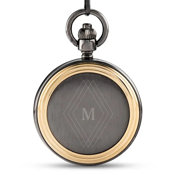 Personalized Gold Frame Gunmetal Pocket Watch & Fob – Diamond Emblem Monogram
