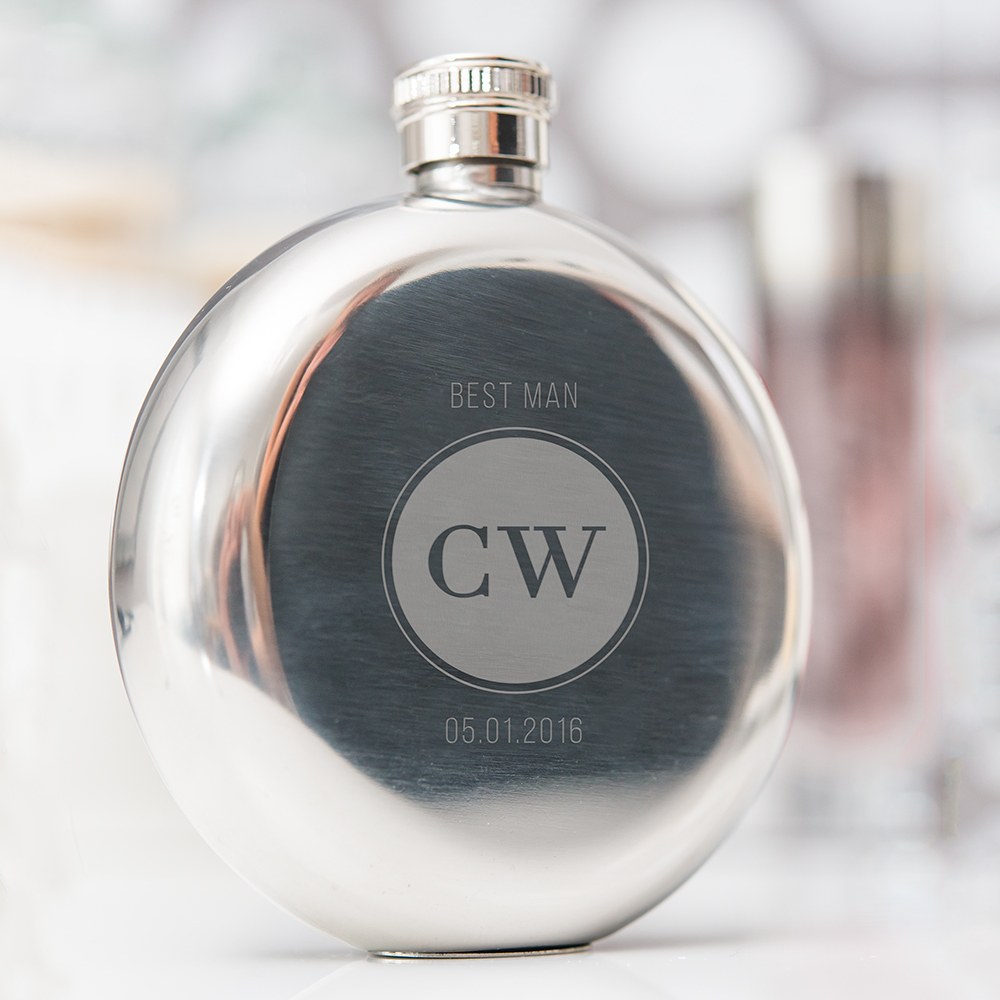 Personalised Silver Stainless Steel Round Hip Flask – Circle Monogram Engraving