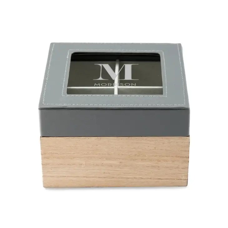 Wood And Faux Leather Keepsake Box With Glass Lid – Initial Monogram